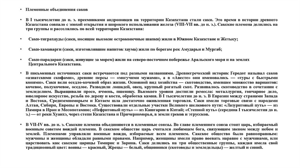 • Племенные объединения саков• В I тысячелетии до н. э. преемниками андроновцев на территории Казахстана стали саки. Это время в истории древнего