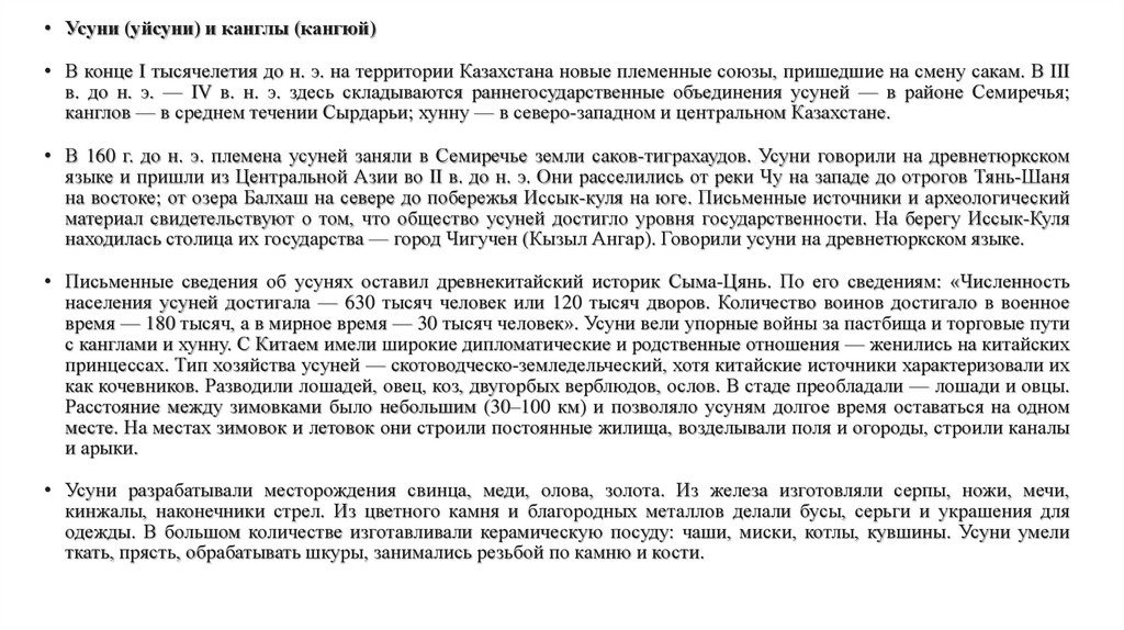 • Усуни (уйсуни) и канглы (кангюй)• В конце I тысячелетия до н. э. на территории Казахстана новые племенные союзы, пришедшие на смену сакам. В III