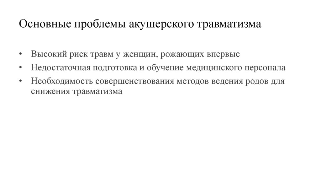 Основные проблемы акушерского травматизма• Высокий риск травм у женщин, рожающих впервые