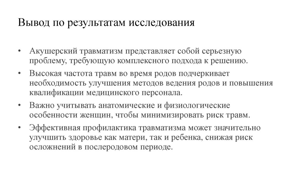 Вывод по результатам исследования• Акушерский травматизм представляет собой серьезную