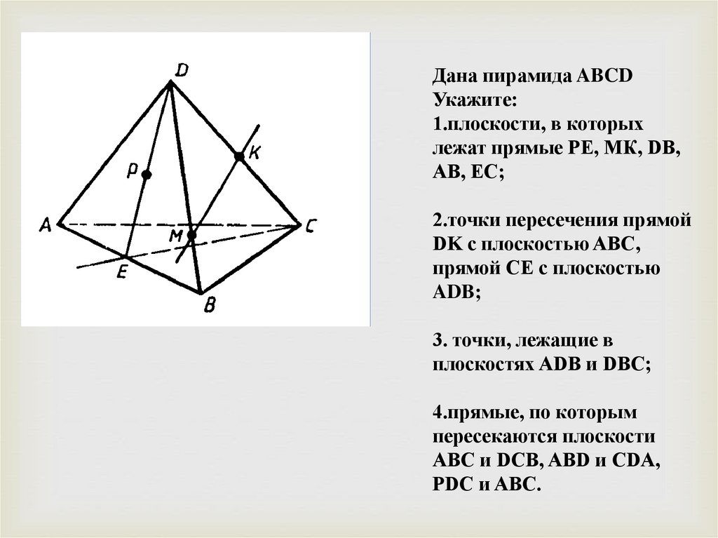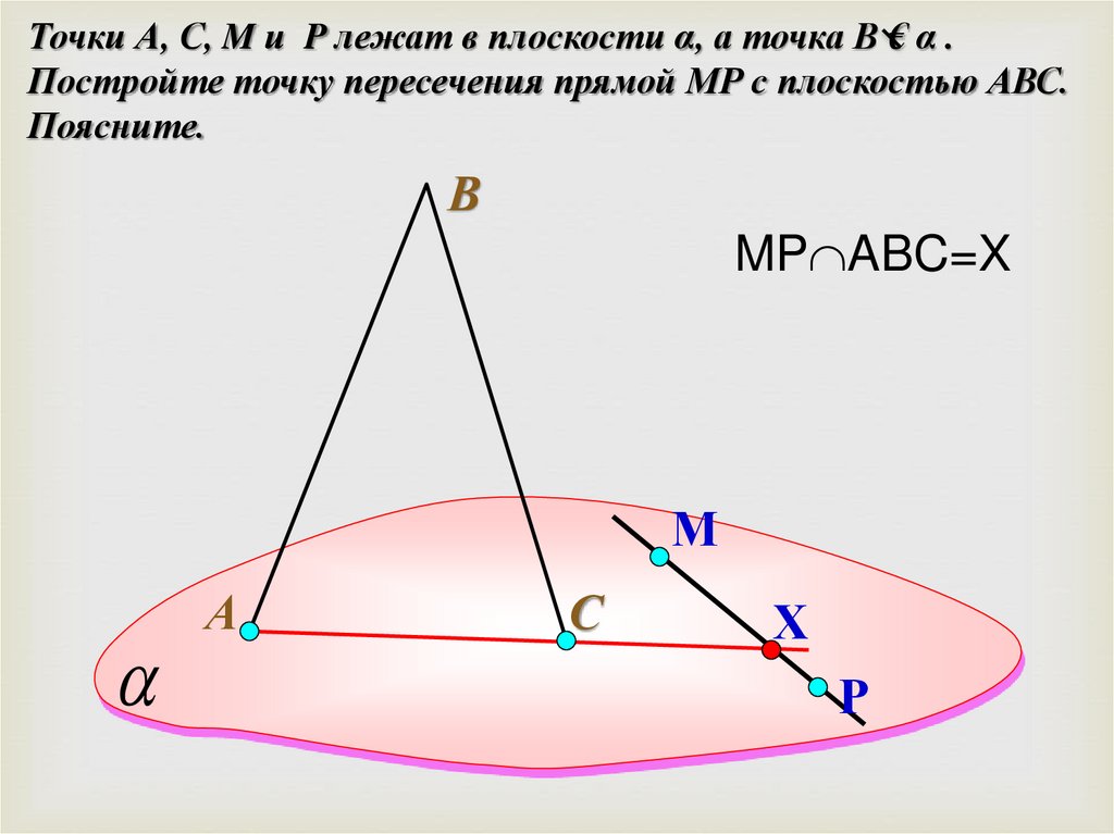 Точки А, С, M и P лежат в плоскости α, а точка В € α .Постройте точку пересечения прямой МР с плоскостью АВС.