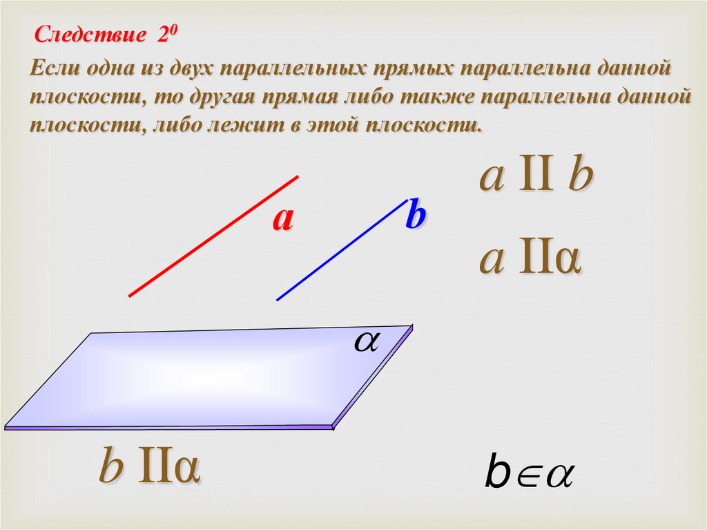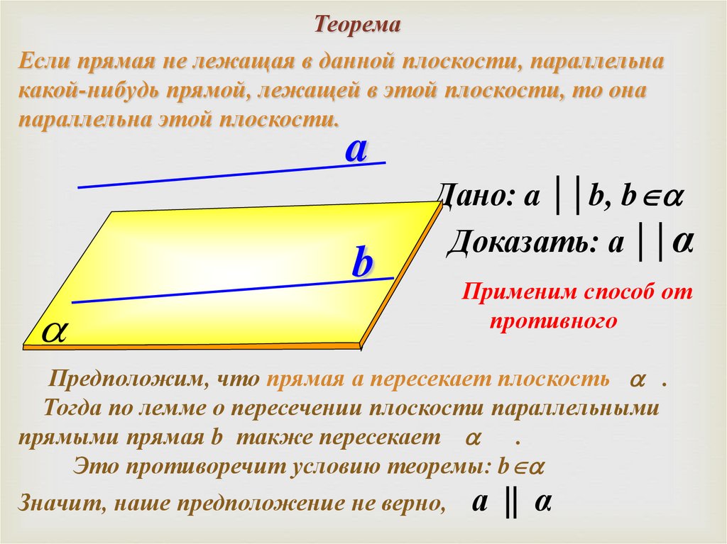 ТеоремаЕсли прямая не лежащая в данной плоскости, параллельна