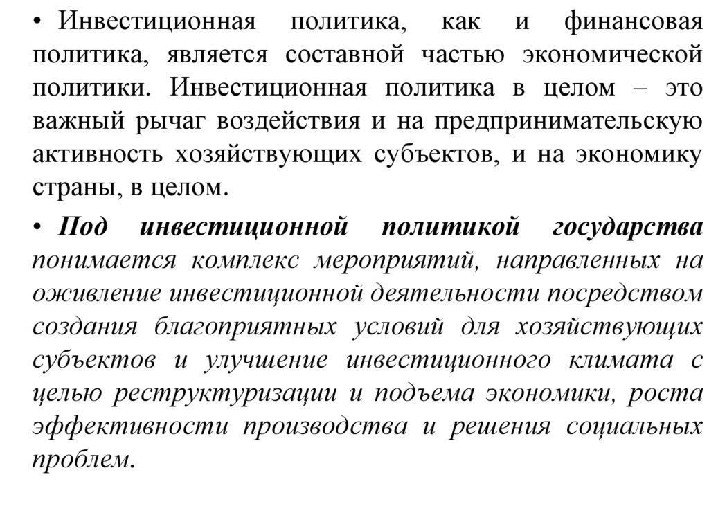 • Под инвестиционной политикой предприятияпонимается комплекс мероприятий, обеспечивающих