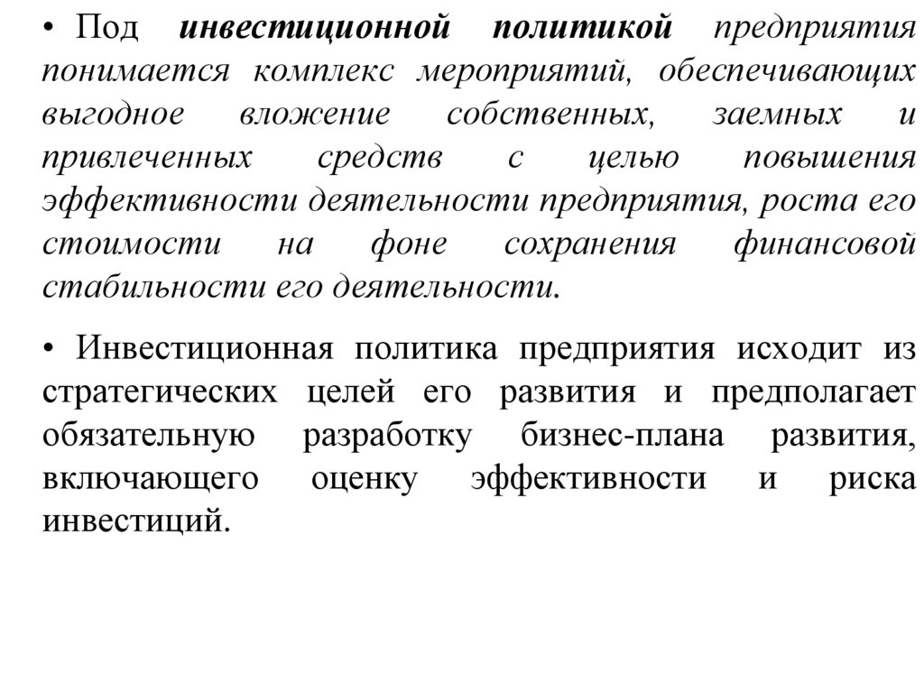 • Инвестиционная политика предприятия исходит из