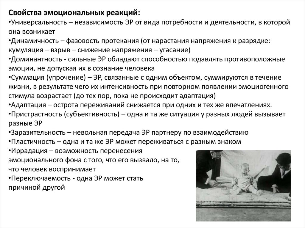 Свойства эмоциональных реакций:•Универсальность – независимость ЭР от вида потребности и деятельности, в которой