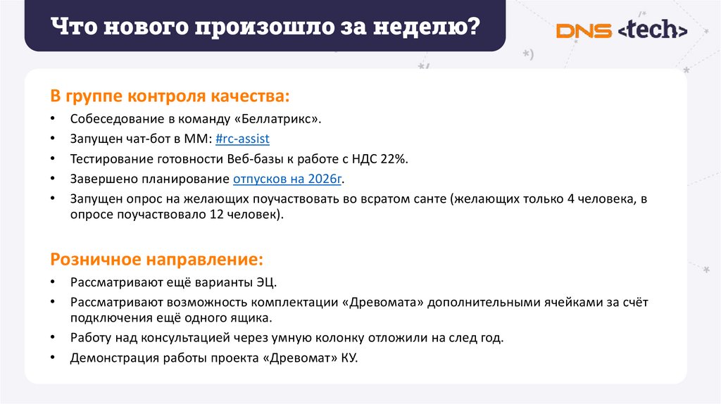 Что нового произошло за неделю?В группе контроля качества: