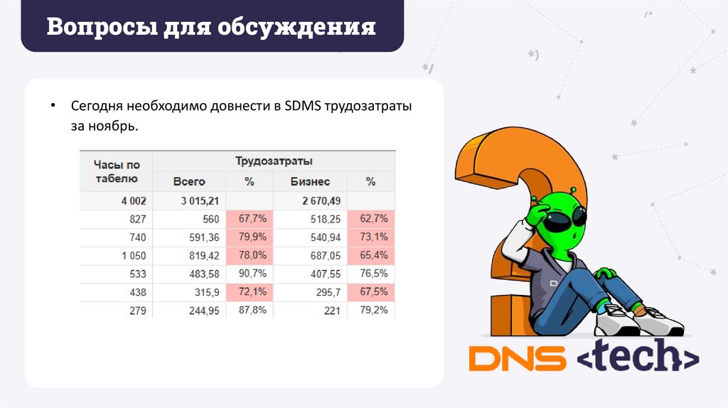 Вопросы для обсуждения• Сегодня необходимо довнести в SDMS трудозатраты