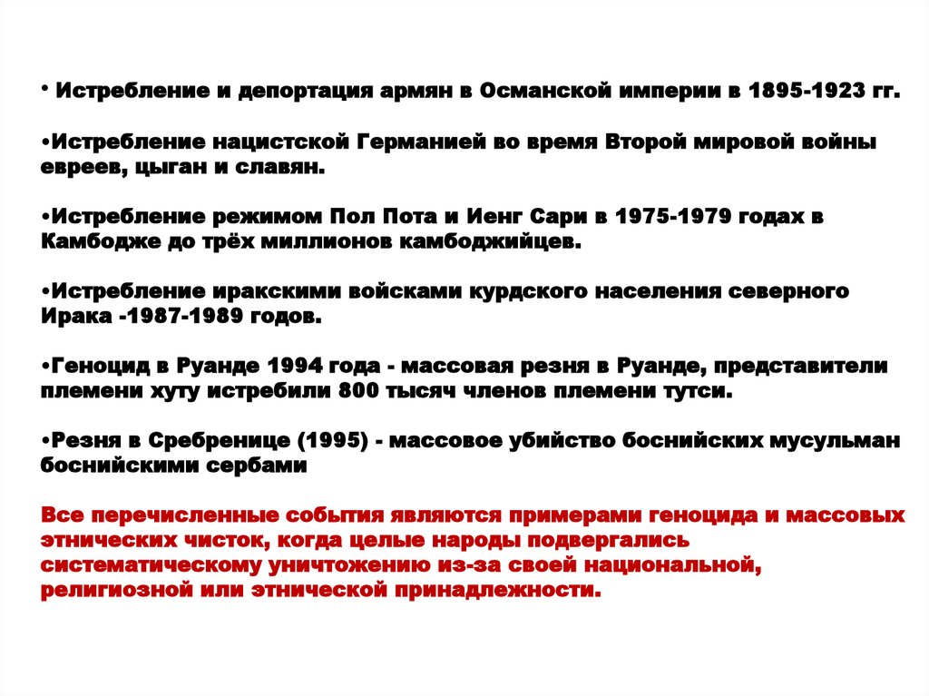 • Истребление и депортация армян в Османской империи в 1895-1923 гг.•Истребление нацистской Германией во время Второй мировой войны