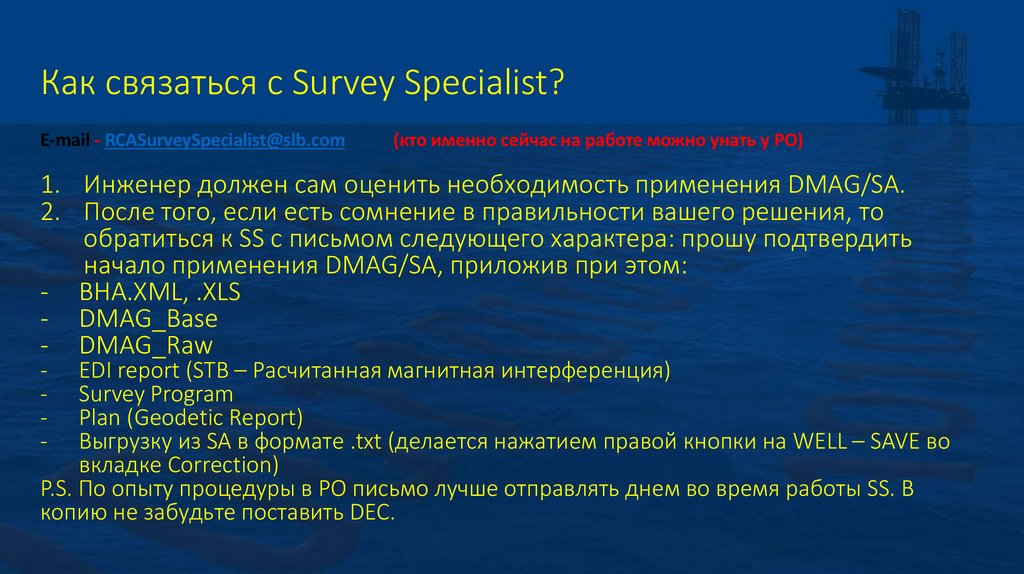 Как связаться с Survey Specialist?E-mail - RCASurveySpecialist@slb.com