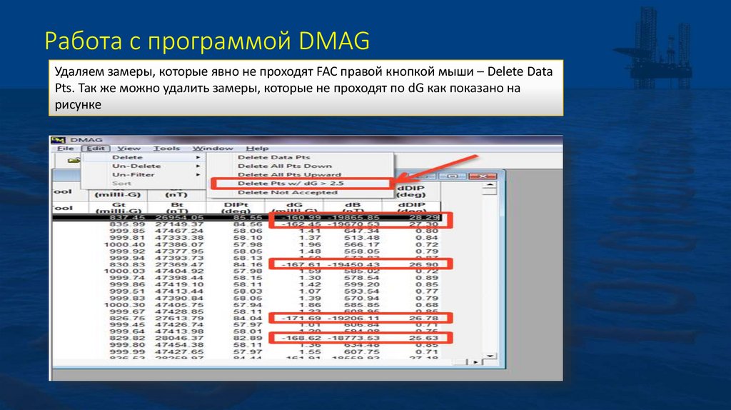Работа с программой DMAGУдаляем замеры, которые явно не проходят FAC правой кнопкой мыши – Delete Data