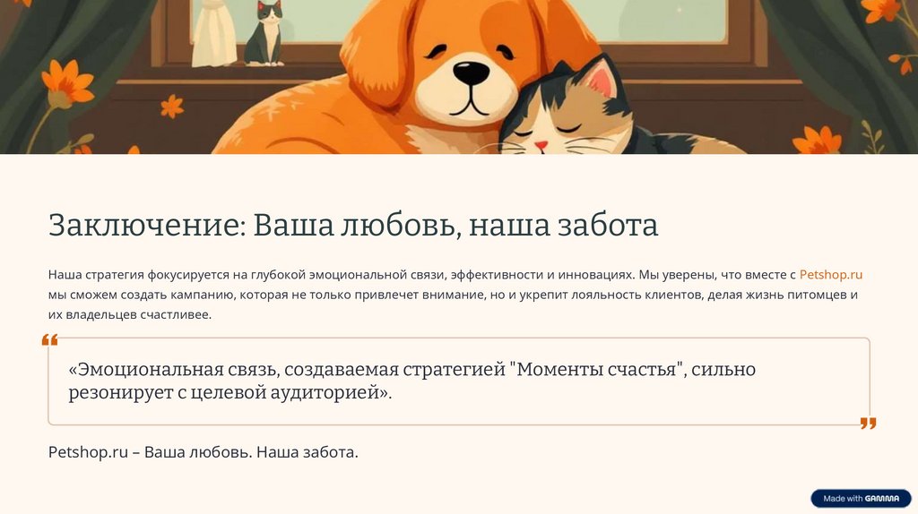 Заключение: Ваша любовь, наша заботаНаша стратегия фокусируется на глубокой эмоциональной связи, эффективности и инновациях. Мы уверены, что вместе с Petshop.ru