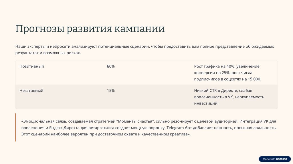 Прогнозы развития кампанииНаши эксперты и нейросети анализируют потенциальные сценарии, чтобы предоставить вам полное представление об ожидаемых