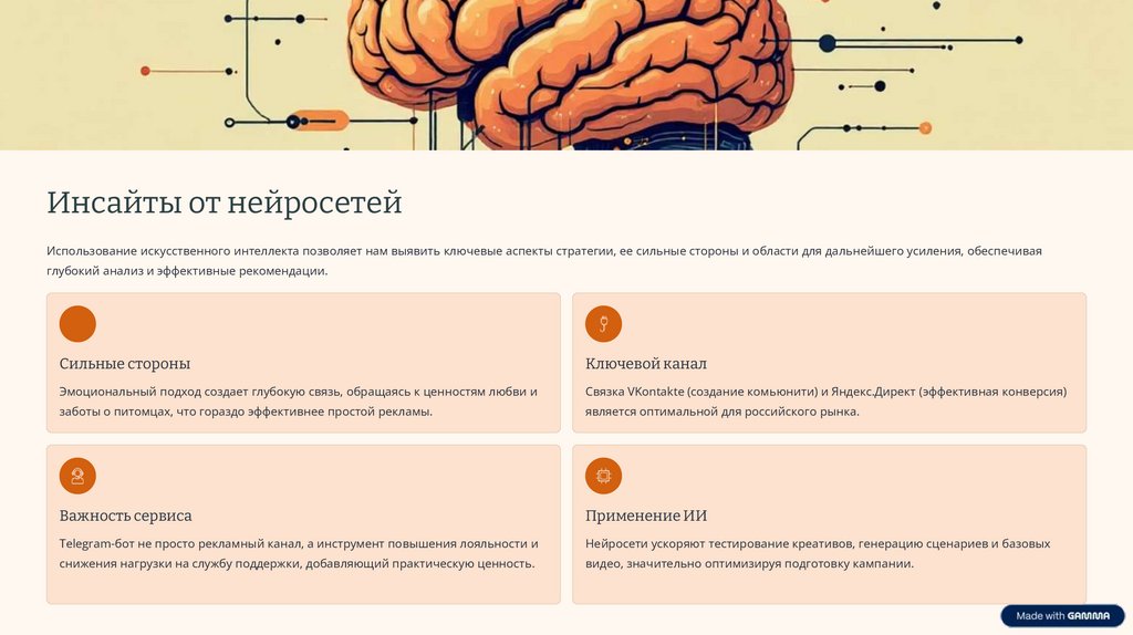 Инсайты от нейросетейИспользование искусственного интеллекта позволяет нам выявить ключевые аспекты стратегии, ее сильные стороны и области для дальнейшего усиления, обеспечивая