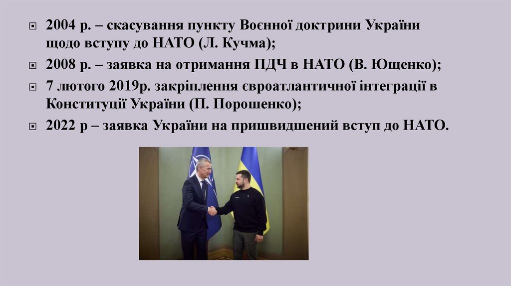 2004 р. – скасування пункту Воєнної доктрини Українищодо вступу до НАТО (Л. Кучма);