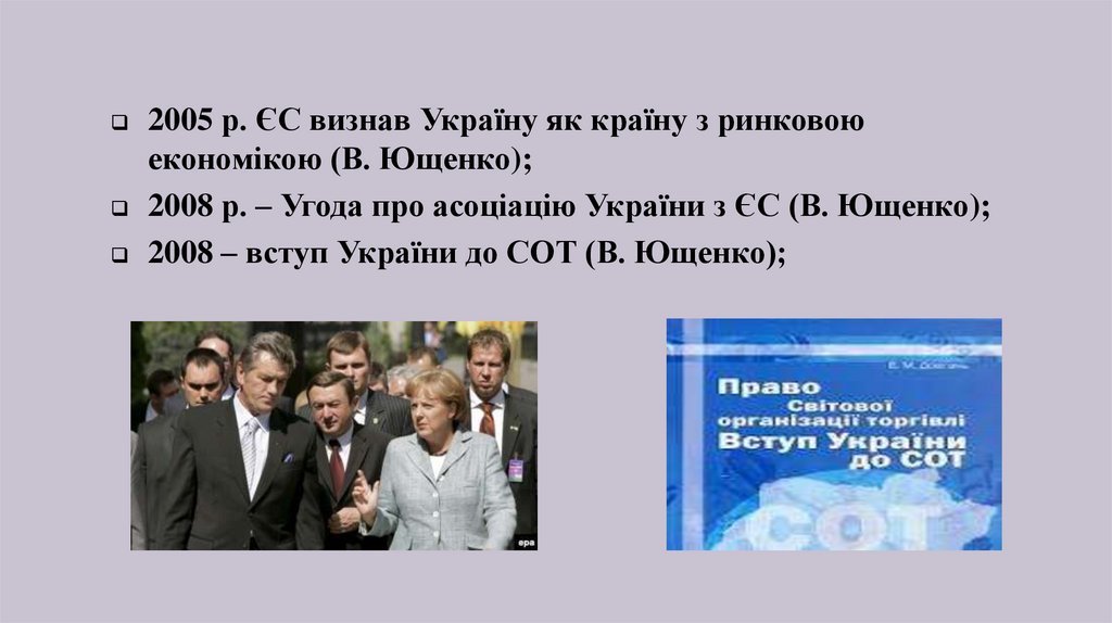 2005 р. ЄС визнав Україну як країну з ринковоюекономікою (В. Ющенко);