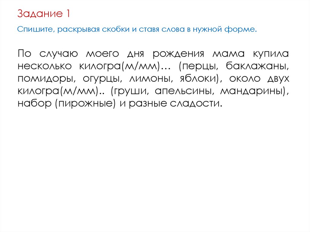 Задание 1Спишите, раскрывая скобки и ставя слова в нужной форме.