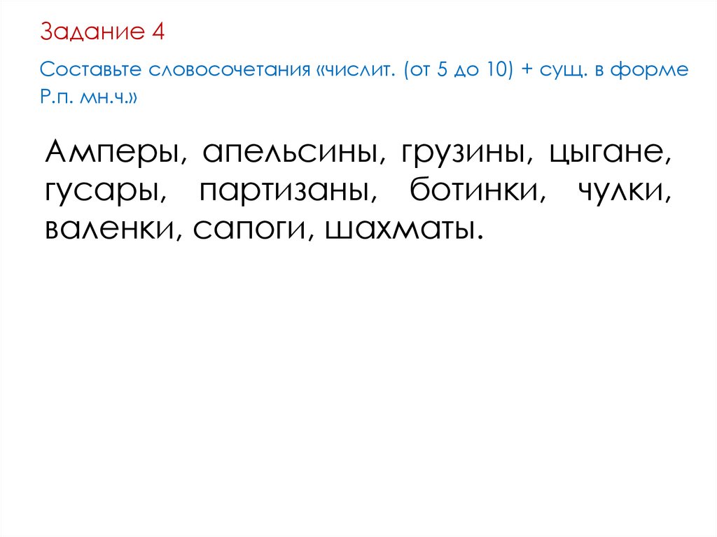 Задание 4Составьте словосочетания «числит. (от 5 до 10) + сущ. в форме