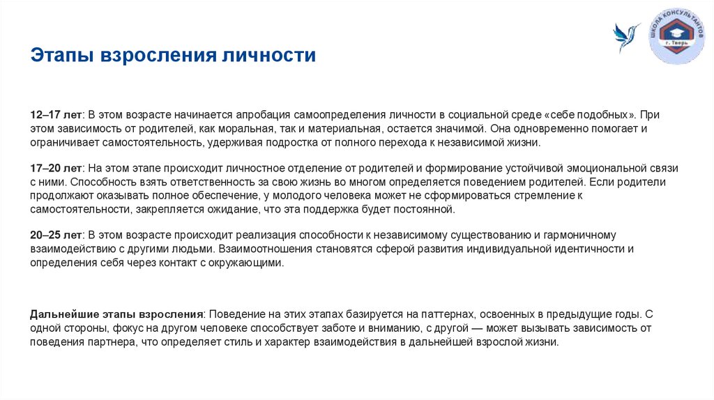 Этапы взросления личности12–17 лет: В этом возрасте начинается апробация самоопределения личности в социальной среде «себе подобных». При