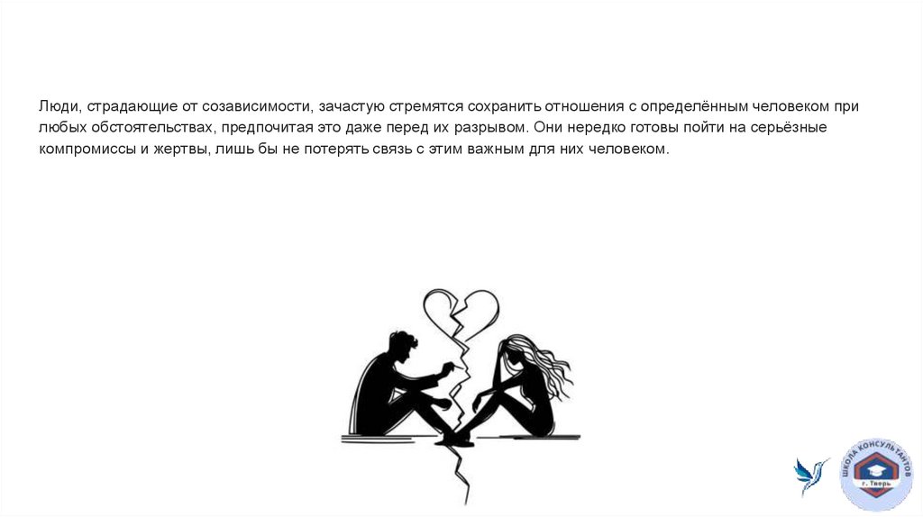 Люди, страдающие от созависимости, зачастую стремятся сохранить отношения с определённым человеком прилюбых обстоятельствах, предпочитая это даже перед их разрывом. Они нередко готовы пойти на серьёзные