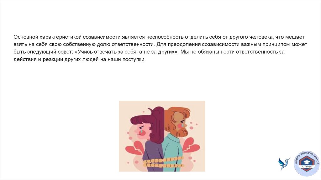 Основной характеристикой созависимости является неспособность отделить себя от другого человека, что мешаетвзять на себя свою собственную долю ответственности. Для преодоления созависимости важным принципом может