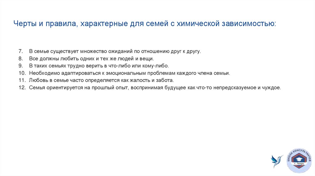 Черты и правила, характерные для семей с химической зависимостью:7. В семье существует множество ожиданий по отношению друг к другу.