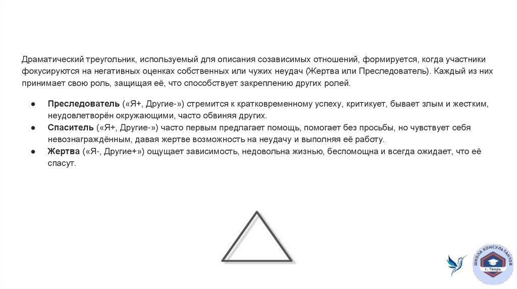 Драматический треугольник, используемый для описания созависимых отношений, формируется, когда участникифокусируются на негативных оценках собственных или чужих неудач (Жертва или Преследователь). Каждый из них