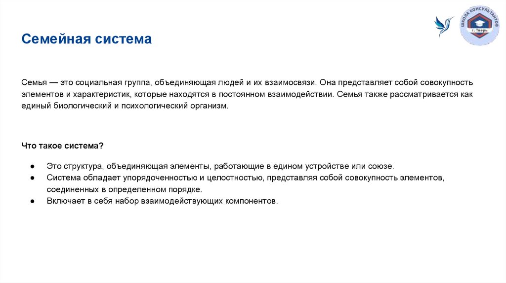 Семейная системаСемья — это социальная группа, объединяющая людей и их взаимосвязи. Она представляет собой совокупность