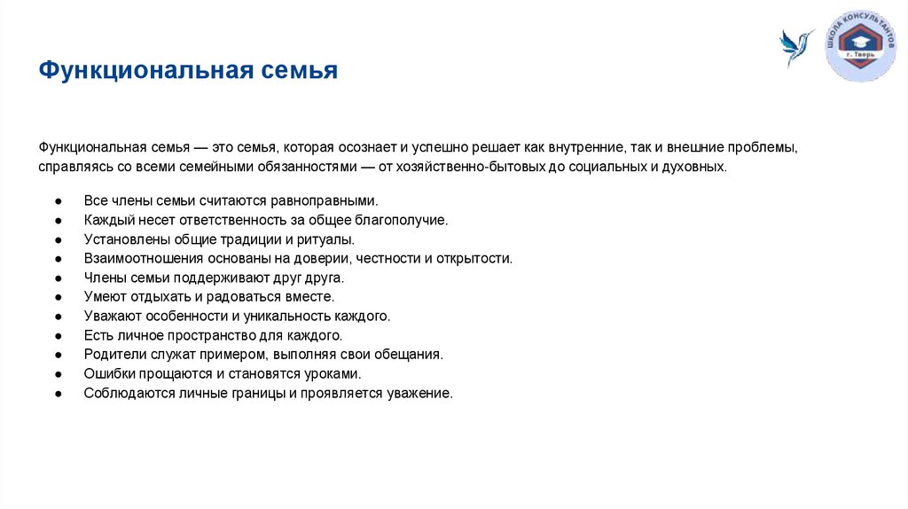 Функциональная семьяФункциональная семья — это семья, которая осознает и успешно решает как внутренние, так и внешние проблемы,