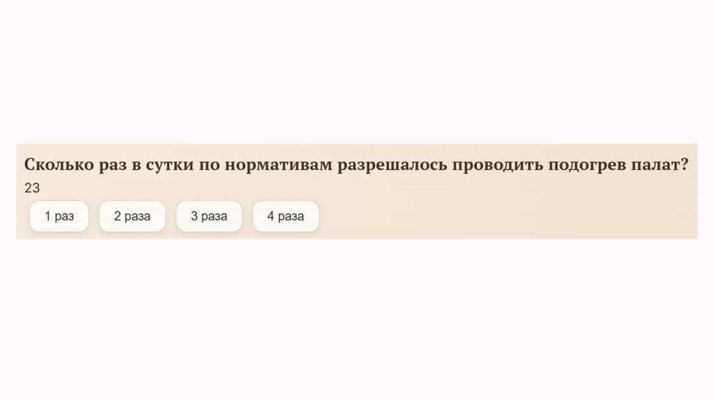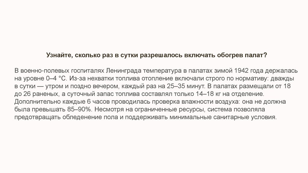 Узнайте, сколько раз в сутки разрешалось включать обогрев палат?В военно-полевых госпиталях Ленинграда температура в палатах зимой 1942 года держалась