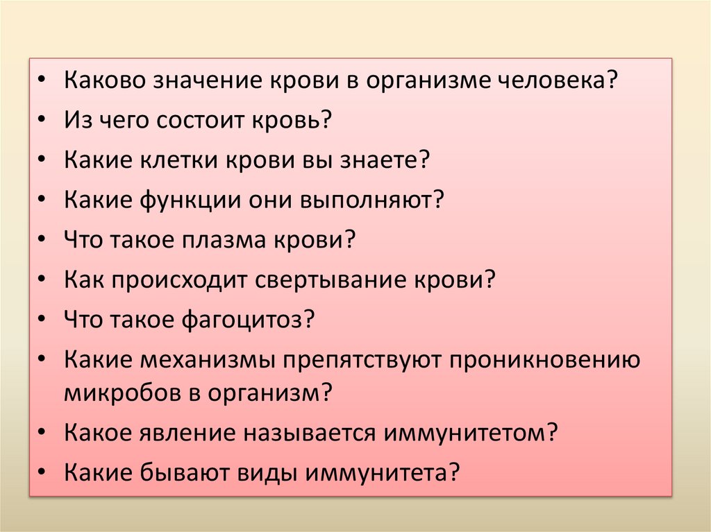 • Каково значение крови в организме человека?• Из чего состоит кровь?