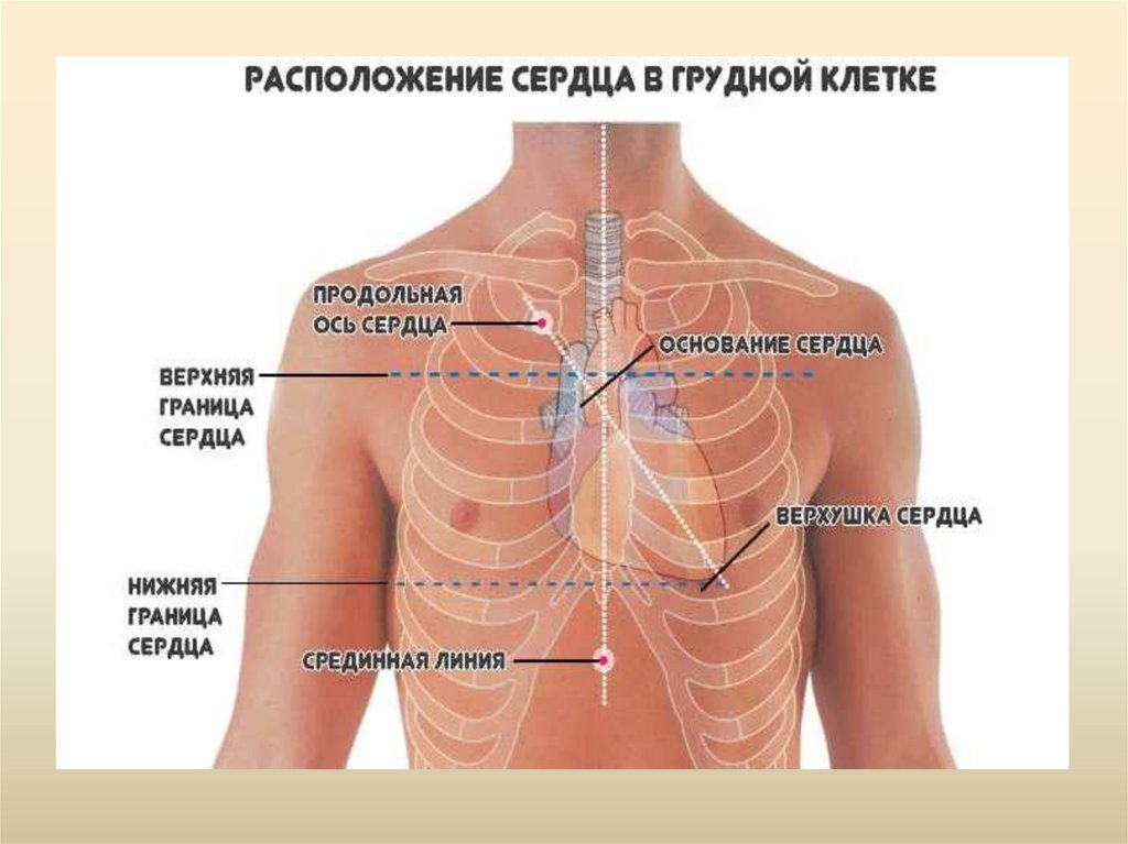 Сердце располагается в центрегрудной клетки, 2/3 в левой стороне