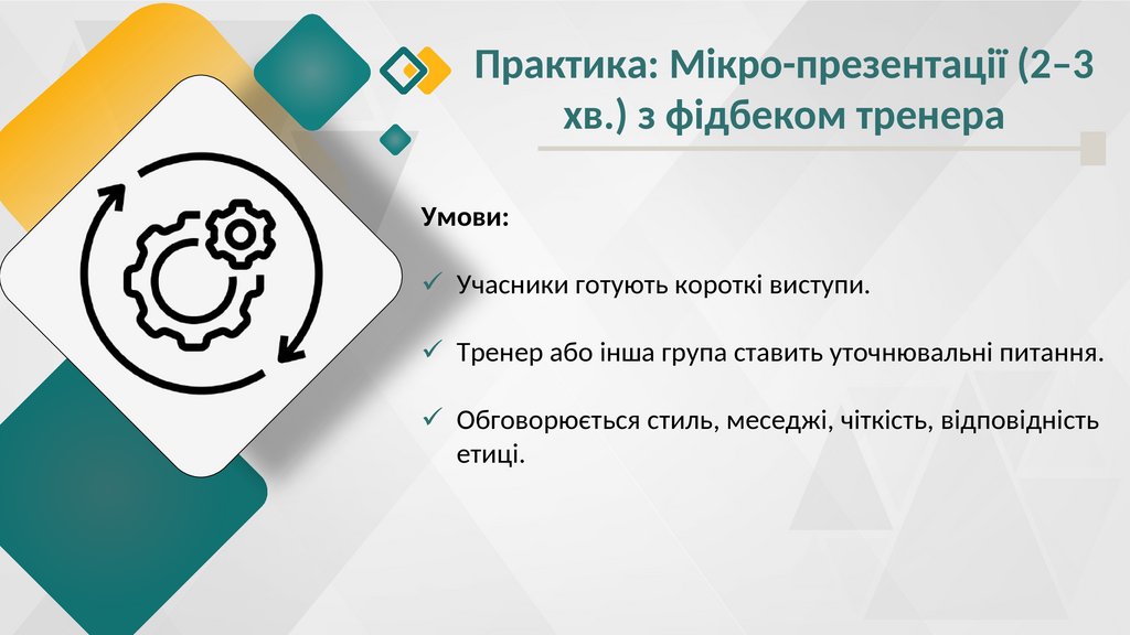 Практика: Мікро-презентації (2–3хв.) з фідбеком тренера