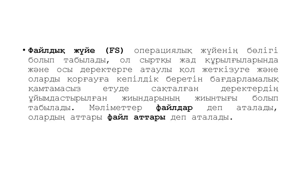 • Файлдық жүйе деректер мен бағдарламаларды қоса, файлмазмұнын сақтауға және алуға арналған механизм болып