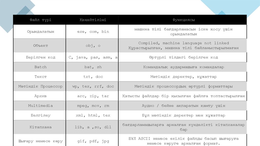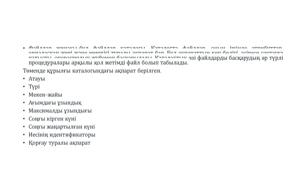 • Файл – дерексіз деректер түрі. Файлды дұрыс анықтау үшін біз онымен орындалатын әртүрлі операциялардықарастыруымыз керек. Операциялық жүйе файлдарды жасау, жазу, оқу, орнын өзгерту, жою және қысқарту үшін