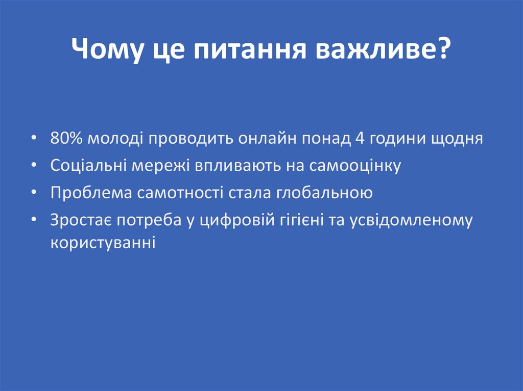 Чому це питання важливе?• 80% молоді проводить онлайн понад 4 години щодня