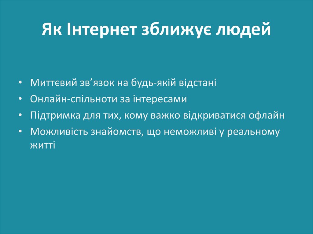 Як Інтернет зближує людей• Миттєвий зв’язок на будь-якій відстані