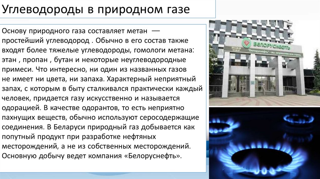 Углеводороды в природном газеОснову природного газа составляет метан —