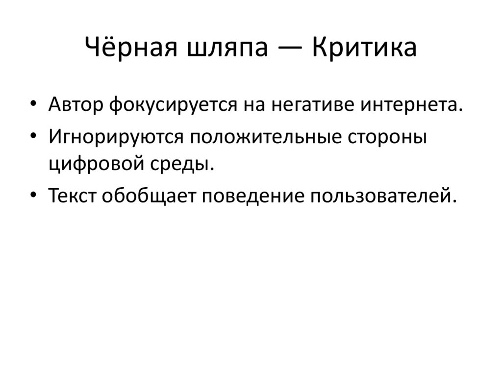 Чёрная шляпа — Критика• Автор фокусируется на негативе интернета.