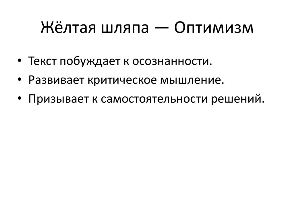 Жёлтая шляпа — Оптимизм• Текст побуждает к осознанности.
