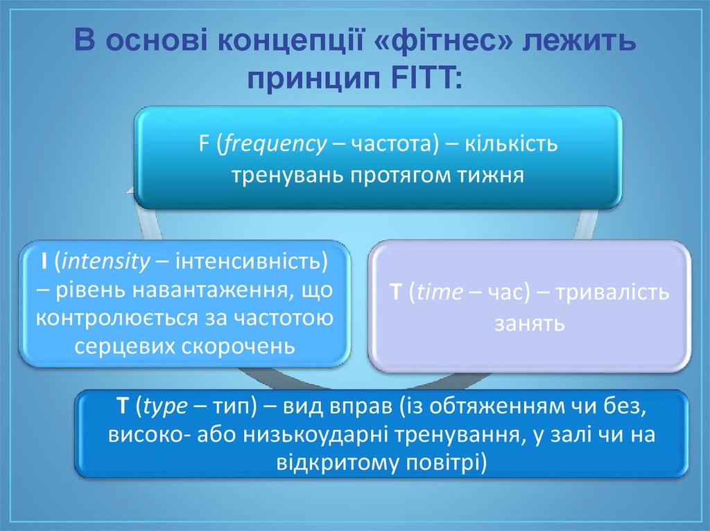 В основі концепції «фітнес» лежитьпринцип FITT: