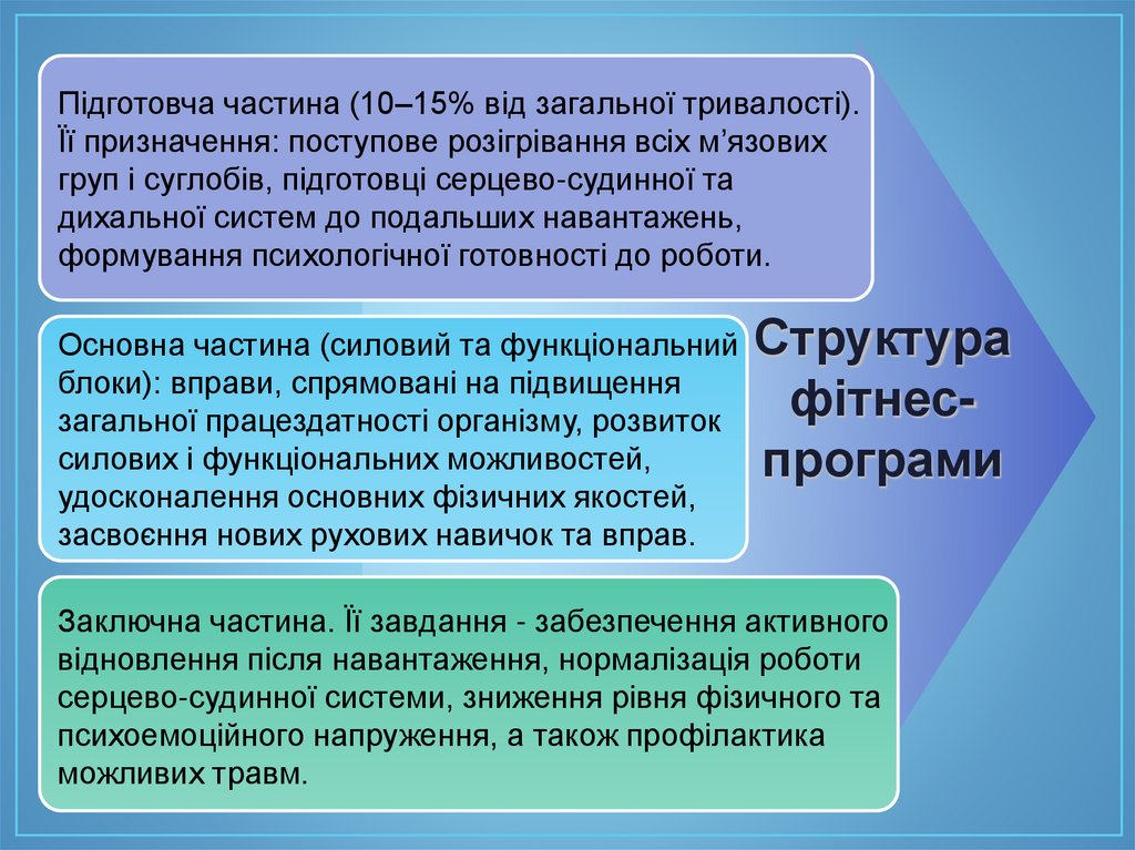 Підготовча частина (10–15% від загальної тривалості).Її призначення: поступове розігрівання всіх м’язових