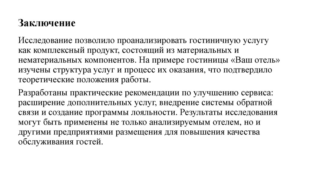 ЗаключениеИсследование позволило проанализировать гостиничную услугу