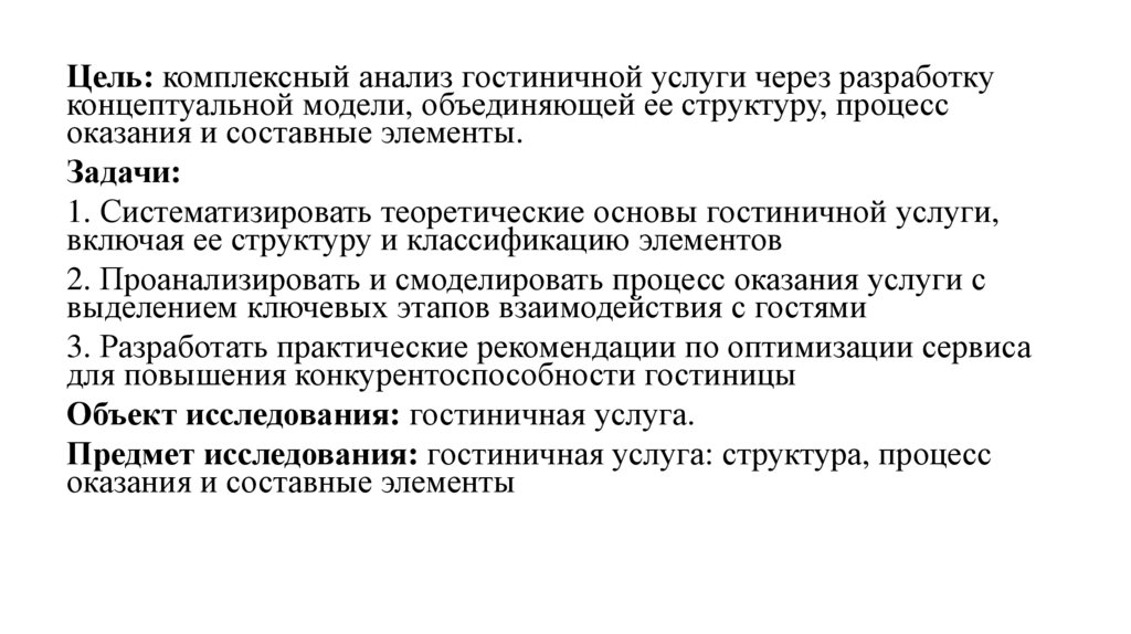 Цель: комплексный анализ гостиничной услуги через разработкуконцептуальной модели, объединяющей ее структуру, процесс