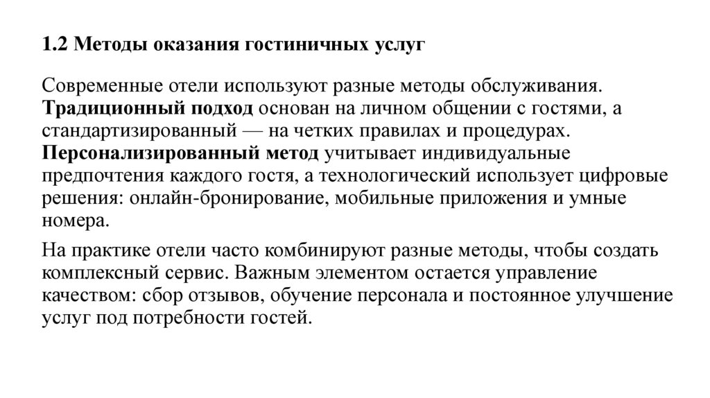 1.2 Методы оказания гостиничных услугСовременные отели используют разные методы обслуживания.