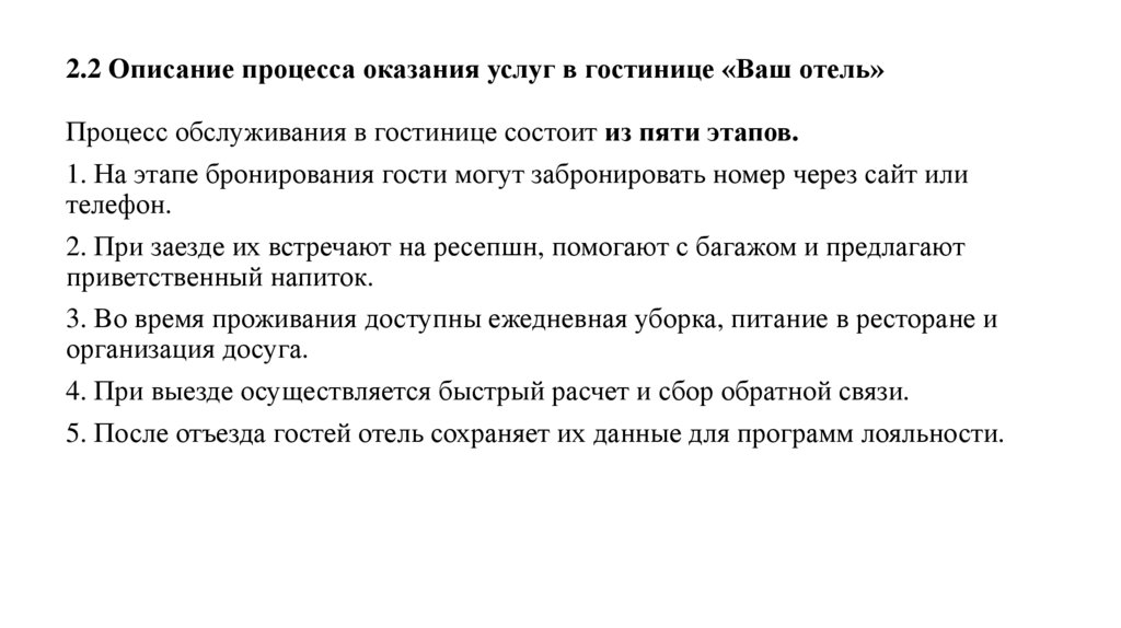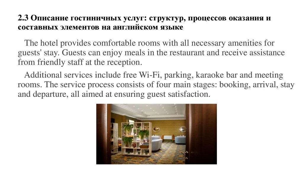 2.3 Описание гостиничных услуг: структур, процессов оказания исоставных элементов на английском языке
