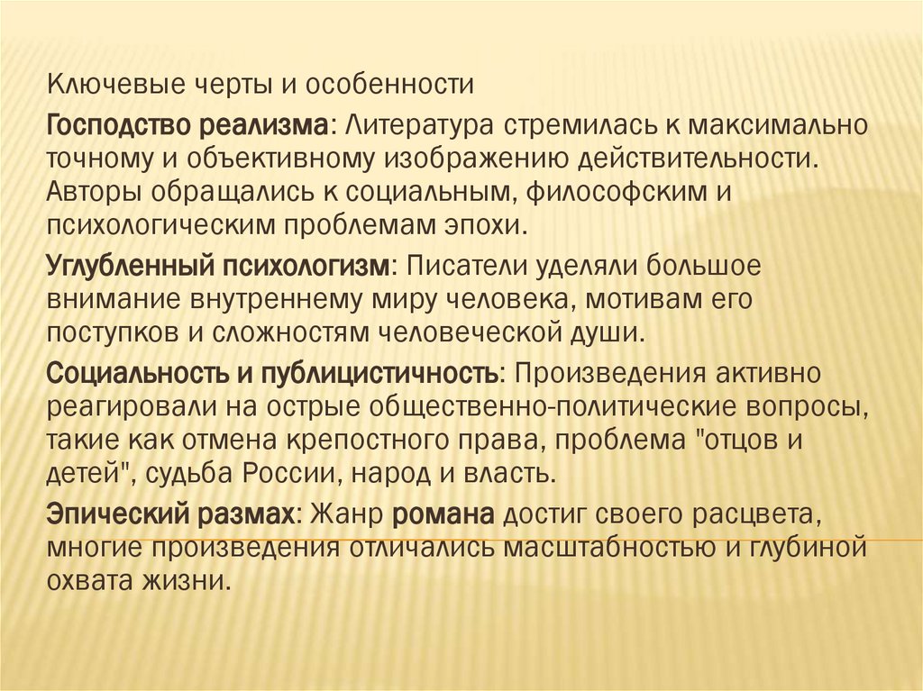 Ключевые черты и особенностиГосподство реализма: Литература стремилась к максимально