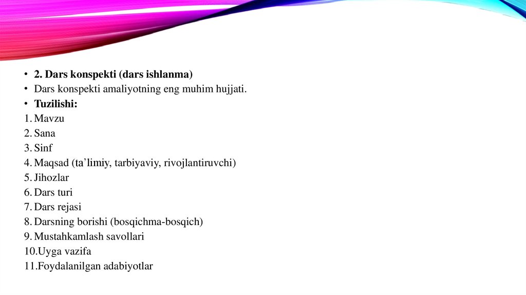 • 2. Dars konspekti (dars ishlanma)• Dars konspekti amaliyotning eng muhim hujjati.