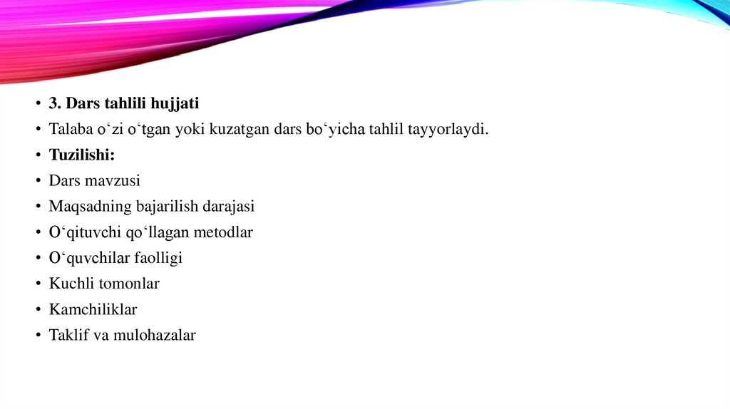 • 3. Dars tahlili hujjati• Talaba o‘zi o‘tgan yoki kuzatgan dars bo‘yicha tahlil tayyorlaydi.