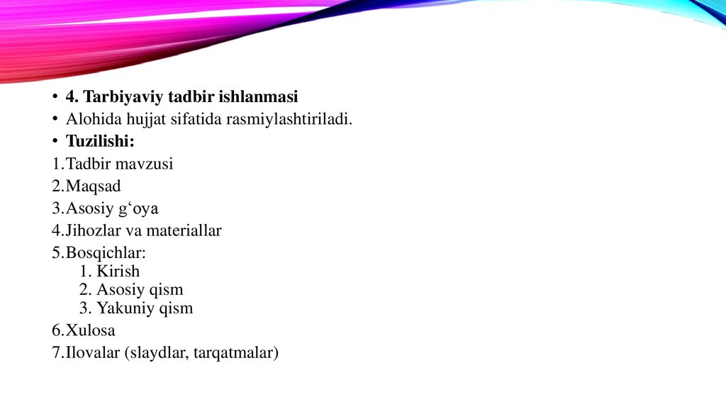 • 4. Tarbiyaviy tadbir ishlanmasi• Alohida hujjat sifatida rasmiylashtiriladi.
