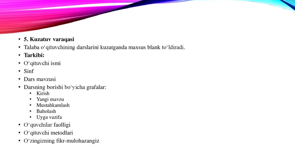 • 5. Kuzatuv varaqasi• Talaba o‘qituvchining darslarini kuzatganda maxsus blank to‘ldiradi.